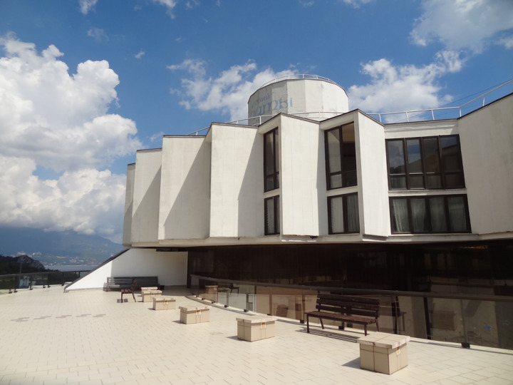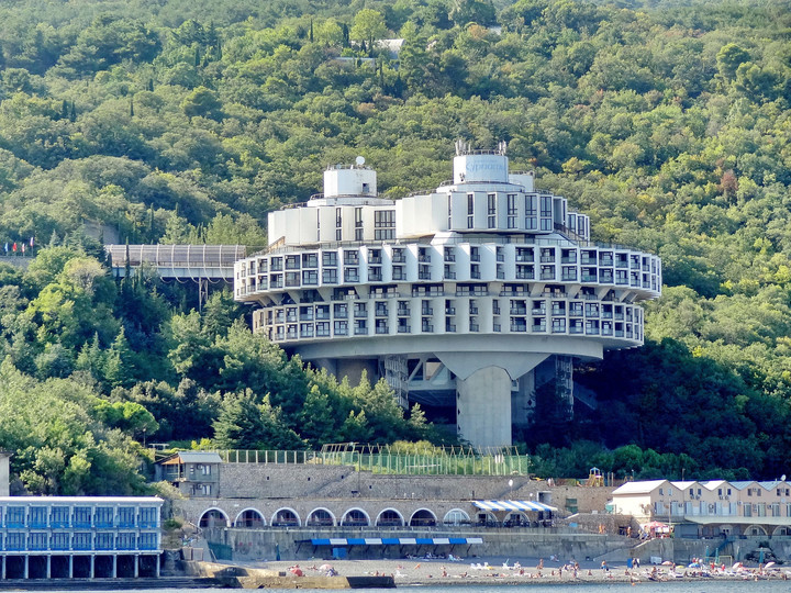 這個(gè)療養(yǎng)院建在烏克蘭的雅爾塔(Yalta,學(xué)過(guò)中學(xué)歷史都聽(tīng)過(guò)這個(gè)地方吧)的海邊,像一個(gè)飛碟停在一根大柱子上面,現(xiàn)在就是個(gè)休閑娛樂(lè)場(chǎng)所。