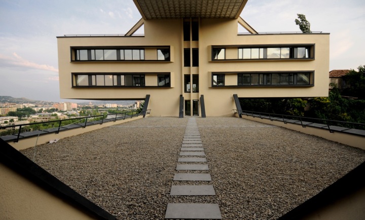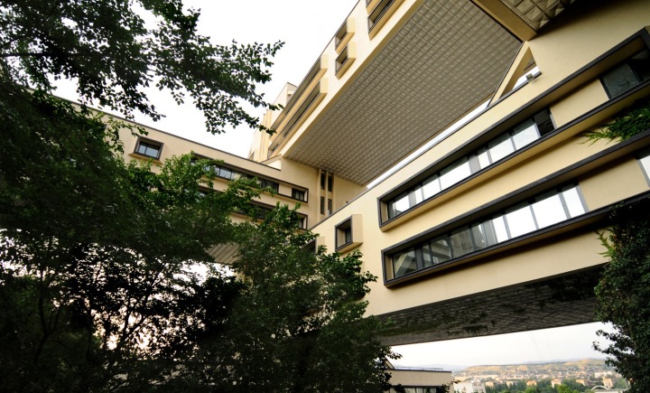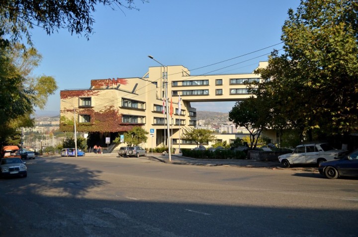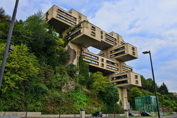 這是前蘇聯(lián)的一個(gè)標(biāo)識(shí)化的未來(lái)主義建筑,在格魯吉亞的首都Tbilisi(第比利斯),當(dāng)初修建了是為了當(dāng)他們高速公路部(一個(gè)政府部門(mén))的辦公大樓的。建筑師就是當(dāng)時(shí)的高速路部長(zhǎng)Giorgi Chakhava。設(shè)計(jì)就是為了讓建筑更少量地接觸地面,陽(yáng)光可以從更多的角度照射進(jìn)窗子。