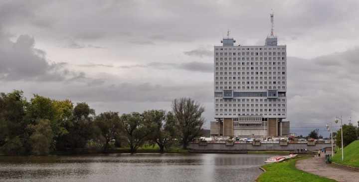 這個(gè)棟爛尾樓是蘇聯(lián)的粗野主義(Brutalist style)的一個(gè)典范。這棟樓在俄羅斯的飛地Kaliningrad(加里寧格勒,在立陶宛和波蘭之間),而且所在這片地非常出名,就是在K?nigsberg castle(哥尼斯堡城堡)原址上修建出來(lái)的。因?yàn)楦缒崴贡こ潜ぴ诙?zhàn)時(shí)被炸得幾乎不能復(fù)原,所以直接拆了,原址基礎(chǔ)上修了這么一個(gè)怪物。后來(lái)還是因?yàn)樵?005年,加里寧格勒60周年紀(jì)念,普金大帝要來(lái)視察情況,才把外墻給涂了顏料,還安裝了玻璃窗。因?yàn)橥庑纹嫣?,像個(gè)機(jī)器人腦袋,當(dāng)?shù)厝硕冀兴氨煌谅竦臋C(jī)器人”。