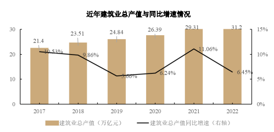 根據(jù)中國(guó)建筑業(yè)協(xié)會(huì)數(shù)據(jù),2017 年以來,建筑業(yè)增加值占國(guó)內(nèi)生產(chǎn)總值的比例保持在 6%以上,建筑業(yè)作為國(guó)民經(jīng)濟(jì)支柱產(chǎn)業(yè)的地位穩(wěn)固。