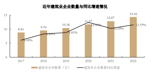 根據(jù)中國(guó)建筑業(yè)協(xié)會(huì)數(shù)據(jù),從建筑企業(yè)數(shù)量來看,截至 2022 年底,我國(guó)共有建筑業(yè)企業(yè) 143,621 家,同比增長(zhǎng) 11.55%。國(guó)有及國(guó)有控股建筑業(yè)企業(yè) 8,914 個(gè),比上年增加 1,088 個(gè),占建筑業(yè)企業(yè)總數(shù)的 6.21%。